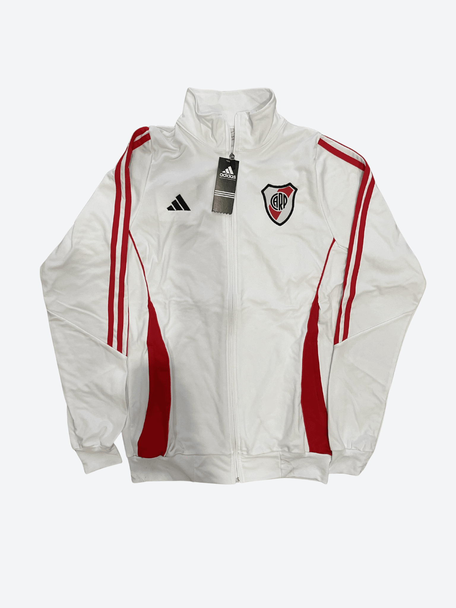 Campera River Plate blanca. Llevá tu fanatismo a todas partes sin perder el estilo. Confeccionada con materiales de alta retención térmica y transpirabilidad. Cuenta con bolsillos laterales con cierre y detalles de calidad premium en cierres y costuras.